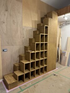 ▽床のフローリングも施工され、段差部分の造作をちょうど作ってくれているところでした