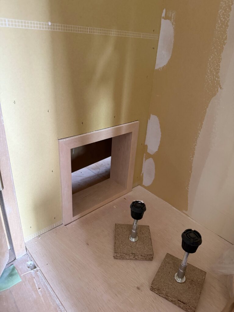 正面の白い棚に鏡が取り付けられれば、こちらも完成です。