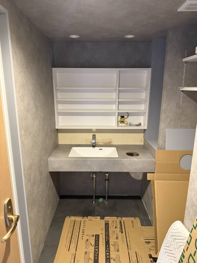 洗面台も設置済みで、今回は空間全体をグレー系で統一しています。